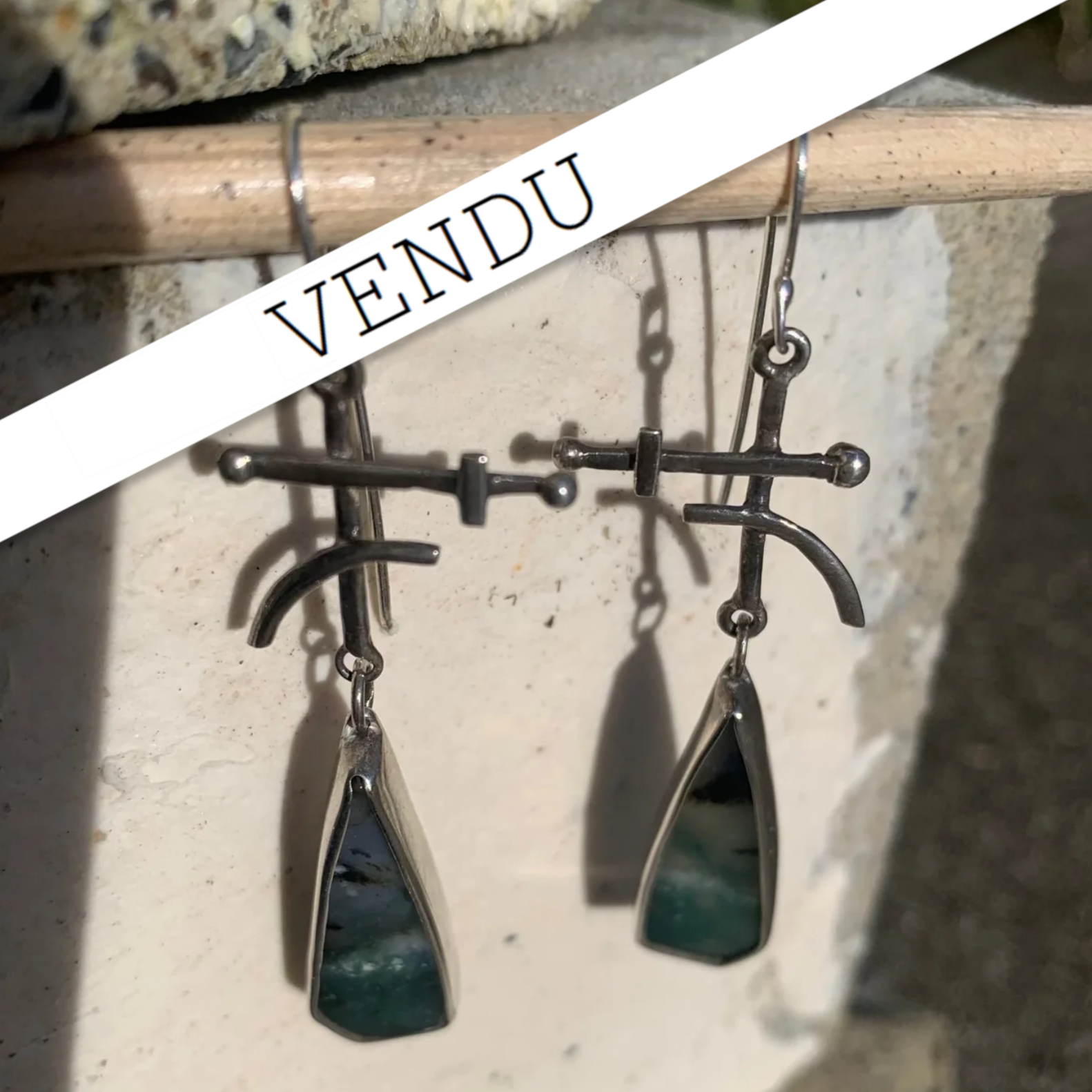 Characteristics : 950 silver earrings (9.33gr. of silver), oxidized with liver of sulfur ( safe for health and skin ), and polished with a brass brush. The archers were deliberately created with silver debris taken and left as is. 2 Green Agates from Java (Indonesia) ( 30x10x6mm / 30x10mmx5mm ); they have a variable hardness of 6.5 to 7 on the Mohs scale. Total weight of the two earrings with gems: 6.59 gr. for one, 6.06 gr. for the second, for a total weight for the pair of 12.65 grams.