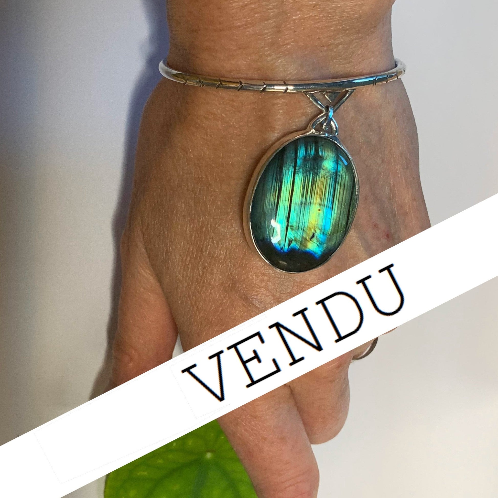 Features : 950 silver bracelet (20.28 gr.); Labradorite measuring 3.5cm x 2.5cm x 0.8cm. Bracelet for a 19cm wrist with a 5cm opening for putting it on. Weight of the set bracelet: 34.02 grams.